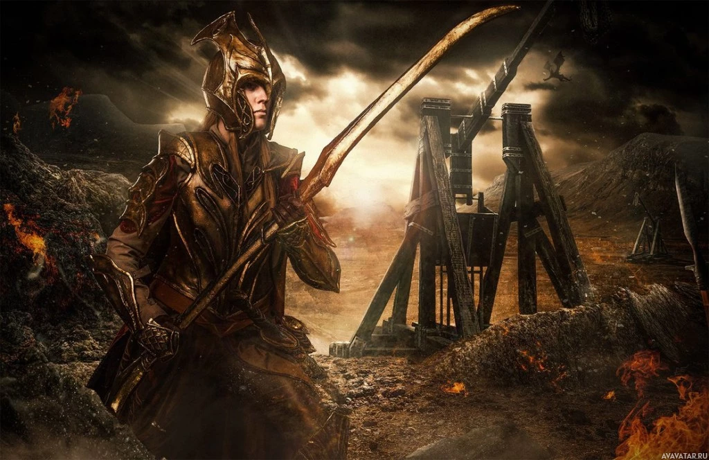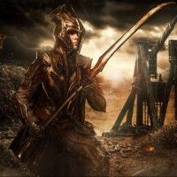a fantasy scene featuring an elf warrior in battle armor. The elf is holding a bow, suggesting they are prepared for combat or archery. In the background, there's a target and a backdrop that could be interpreted as