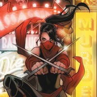a superhero costume, crouched down and holding a pair of swords. The character is wearing a mask that covers their face, which could suggest they are a vigilante or hero. They have