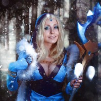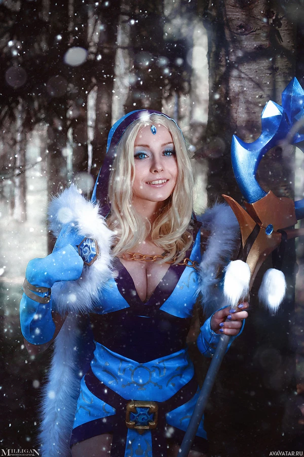 In the image, there is a woman dressed as Crystal Maiden from
