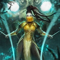 a dynamic pose, holding out what looks like magical energy or light from her hands. The character is adorned in armor that suggests she may have some sort of magical or mystical powers, indicated by the swirling patterns and possibly