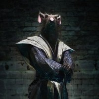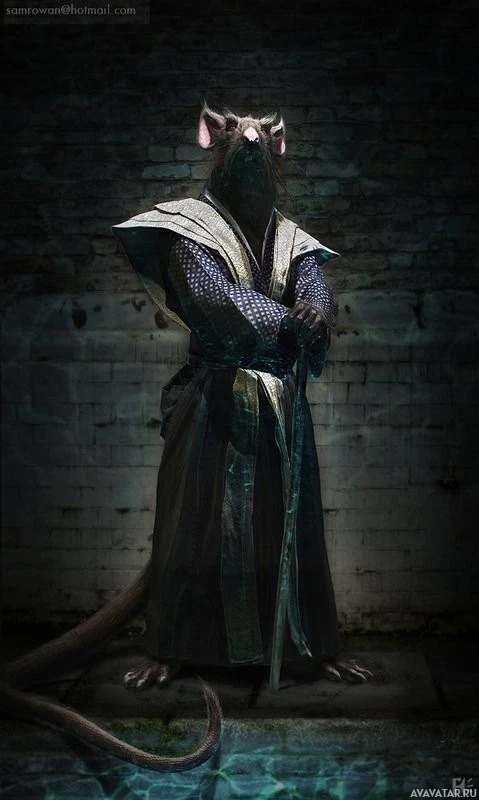 a mutated rat in a human-like attire, standing upright and dressed like a mystic or warrior. This character is often associated with the comic book series "Teenage Mutant