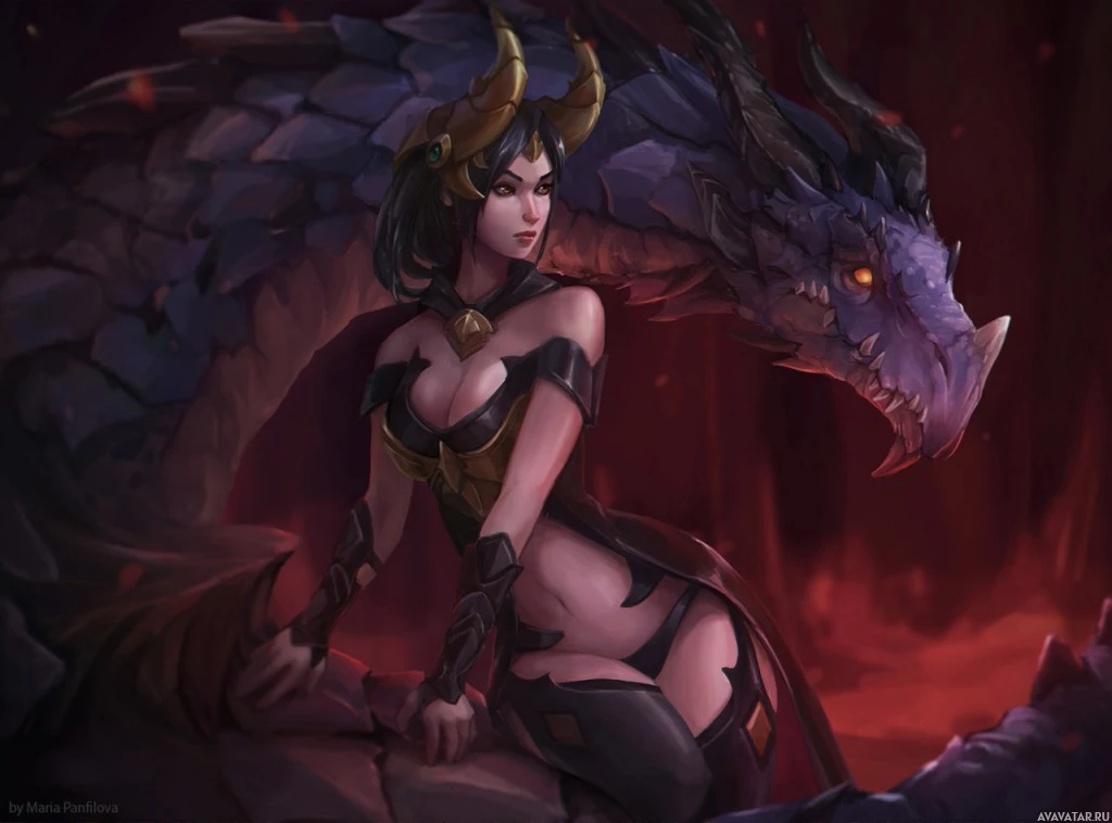 dark hair sitting on the back of a large dragon. She is wearing armor and has what appears to be a horned headpiece, suggesting she might be a warrior or a witch, which are common roles for characters in