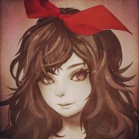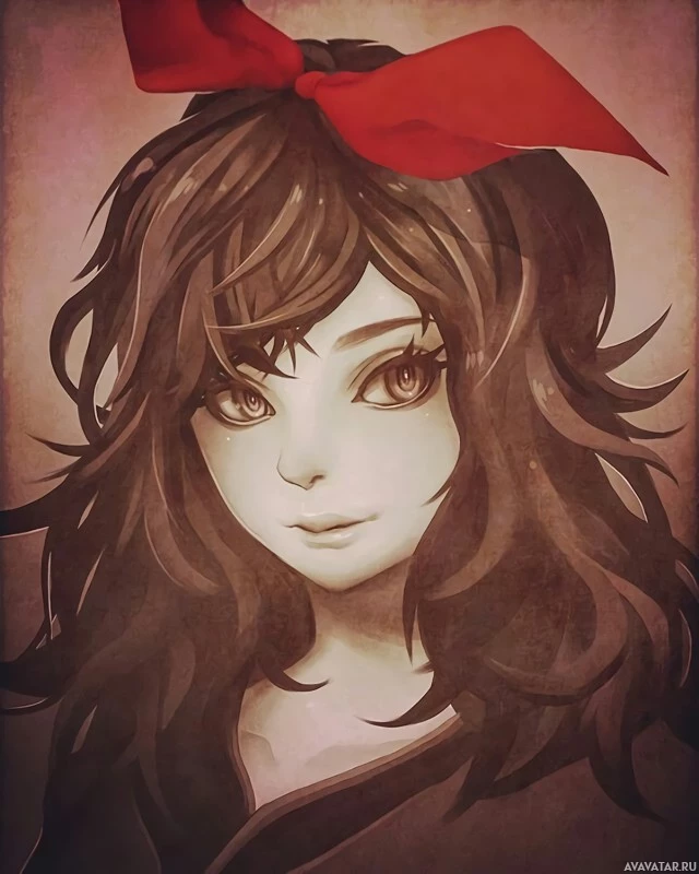 Картинка показывает иллюстрацию девушки с большими выразительными глазами и волосами, стилизованными в стиле панка или эмо. Она носит красный лук на голове. Художественный стиль предполагает, что это может быть манга или комикс.