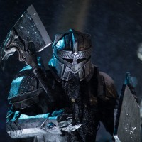 defender role, with elements like chainmail and what looks to be a helmet adorned with feathers or decorative plates. The background suggests a dimly lit