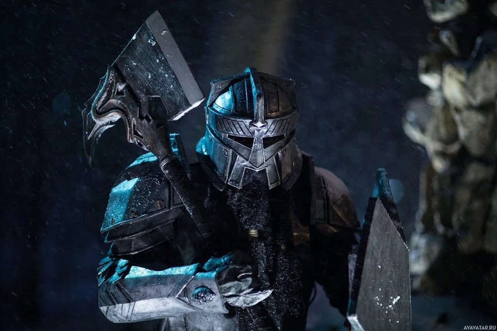 a fantasy setting, possibly a dwarf given the context you provided. This character is holding an axe in one hand and a shield in the other. The shield has