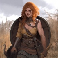 historical setting. She is dressed as a warrior, wearing armor and holding a shield. There's also an axe resting against her shoulder. The background suggests