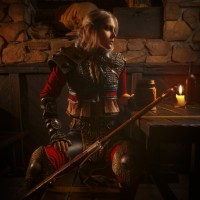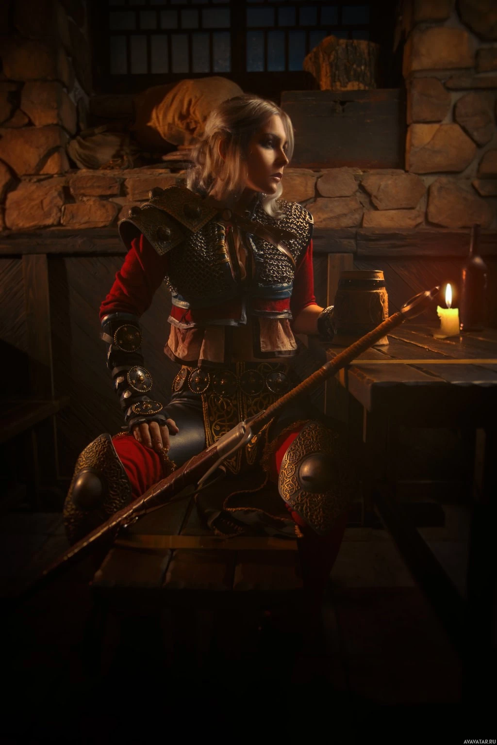 The image features a person dressed in a fantasy-style armor and holding what appears to be a sword. They are wearing a helmet with feathers and a cape, and their pose suggests they may be portraying a character from a game or storyline, possibly inspired by characters like Ciri from the "Witcher" series. The setting looks like an old