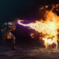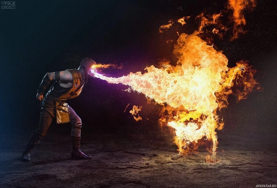 character design. Scorpion appears to be exhaling fire or breathing smoke from his mouth towards the flames, suggesting some form of combustion or