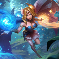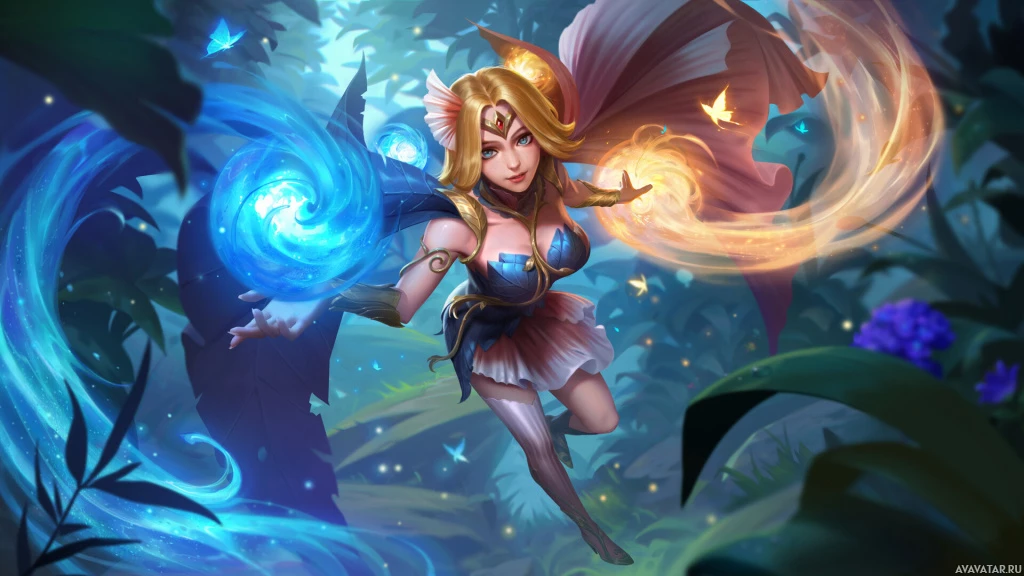 a mystical forest or garden, with glowing lights and plants. This character could be from