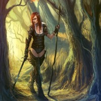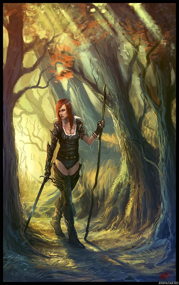 red hair, standing in the middle of a forest. She is wearing armor and wielding what appears to be a sword or dagger in her right hand. There are trees surrounding her, and it's daytime as indicated by