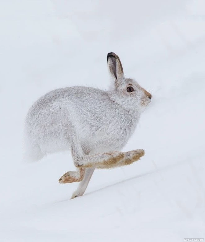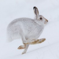 The image shows a hare, which is an animal. It appears to be a snowy environment and the hare seems to be either running or hopping on what looks like a snow-covered ground.