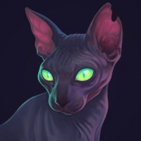 This is an illustration of a Sphynx cat. It has large, expressive green eyes and a distinctive wrinkled skin texture characteristic of the breed. The background is dark, providing a strong contrast that highlights the cat's features.