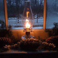 oil lamp with a flame burning inside, situated on a windowsill. The room appears to be decorated for