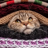 colorful scarves, sweaters, or blankets. The cat appears curious and amused by the situation. The items in front of it have a variety of colors and patterns on them. This picture is often used to illustrate concepts related to organization, tidiness, and finding something amidst clutter due to the cat being hidden behind