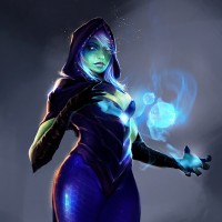 a female character with fantasy elements. She is wearing a purple hooded cloak and has a skull-like face with