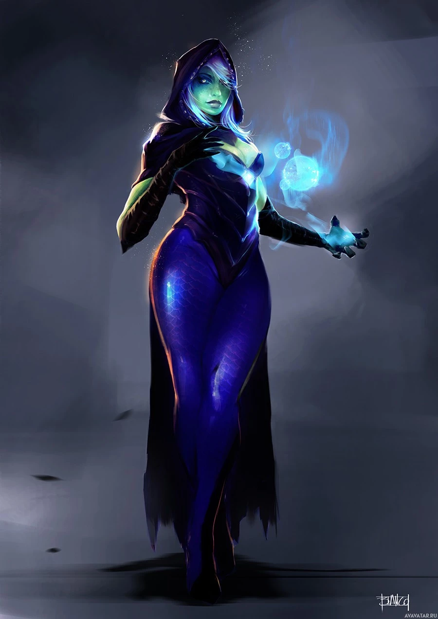 glowing eyes, suggesting she may be a villain or an anti-hero in the context of her story. Her right hand is holding what appears to be a magical wand or staff that is emitting