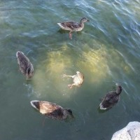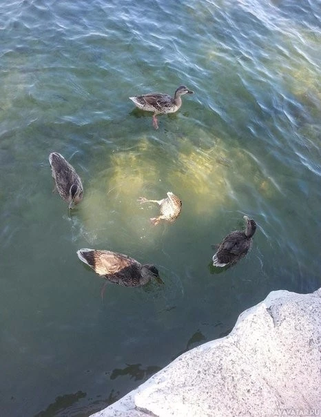 surrounding water has a greenish tint, and the ducks have their feathers puffed up, suggesting they might be preening or trying to keep warm. This scene captures an interaction between wildlife in