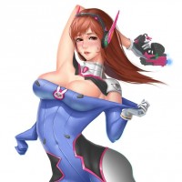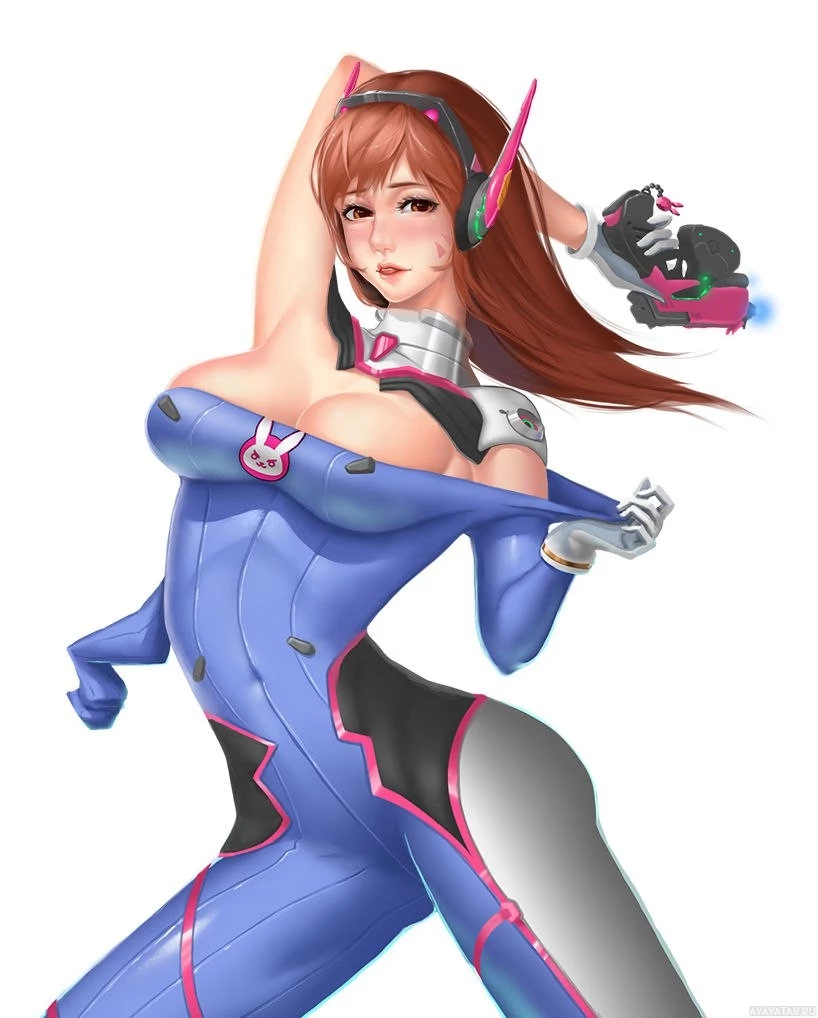 На картинке изображен анимированный персонаж, одетый в футуристический костюм с механическими компонентами и красочными акцентами, напоминающий персонажа Д.Ва из видеоигры «Overwatch». Персонаж показан с одной поднятой рукой и удивленным или обеспокоенным выражением лица.