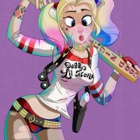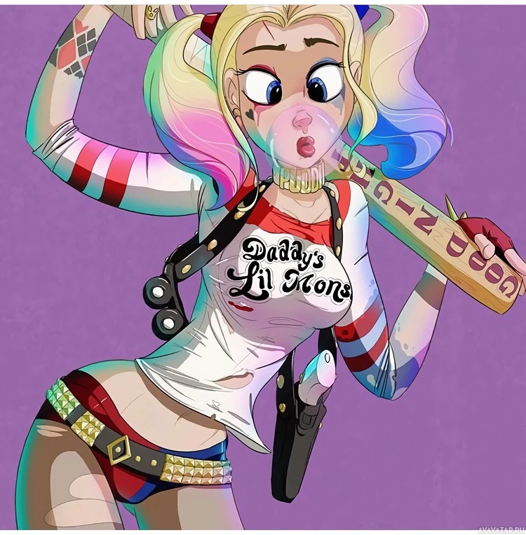 Harley Quinn, a fictional supervillainess in the DC Comics universe. She is depicted with her signature multicolored hair, wearing a red and blue costume with the word "Daddy's Lil Monster" printed on it, and holding what appears to be