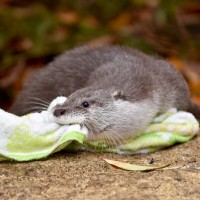 feet in the air, seemingly relaxed and comfortable. The otter is positioned next to what seems like a piece of fabric, possibly a cloth or a blanket, suggesting that this could be