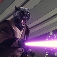 the Star Wars universe, specifically a figure known as Moff Gideon. He is portrayed with cat-like features on his face, such as fur and pointed ears, giving him an anthropomorphic appearance. The character is holding a purple lightsaber, which is