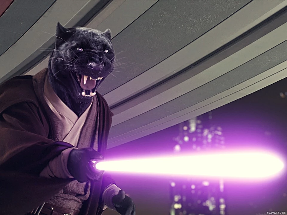 a signature weapon of the Sith and Jedi characters in Star Wars. He is dressed in robes typical of the Empire's high-