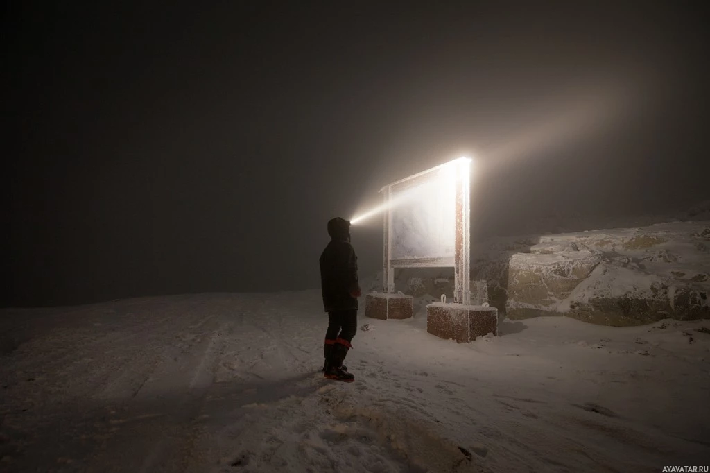 a silhouette of a person standing on a snowy surface at night, illuminated by a flashlight. The person appears to be looking towards a structure or object that is not clearly visible due to the darkness and fog. The scene suggests a cold and potentially remote location, possibly in