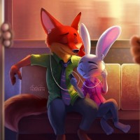 a fictional universe created by Disney where anthropomorphic animals live and work together. The image conveys a sense of companionship and warmth between the two main characters in their