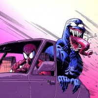 seat of a car, with Spider-Man driving and Venom seated behind him. Spider-Man appears to be wearing his usual costume, while Venom is depicted in his signature black