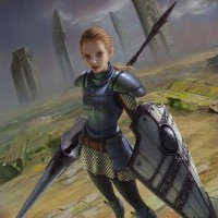 The image features a female character who appears to be a warrior or knight. She has blonde hair and is dressed in armor, complete with a helmet. She is holding a lance in her right hand. The background suggests a battlefield or a scene of conflict, possibly indicating she is preparing for combat.