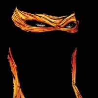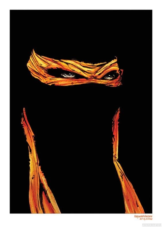 orange bandana covering his eyes and mouth, which is iconic to his character. The artwork has an intense and somewhat dramatic feel, possibly evoking