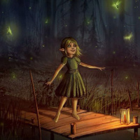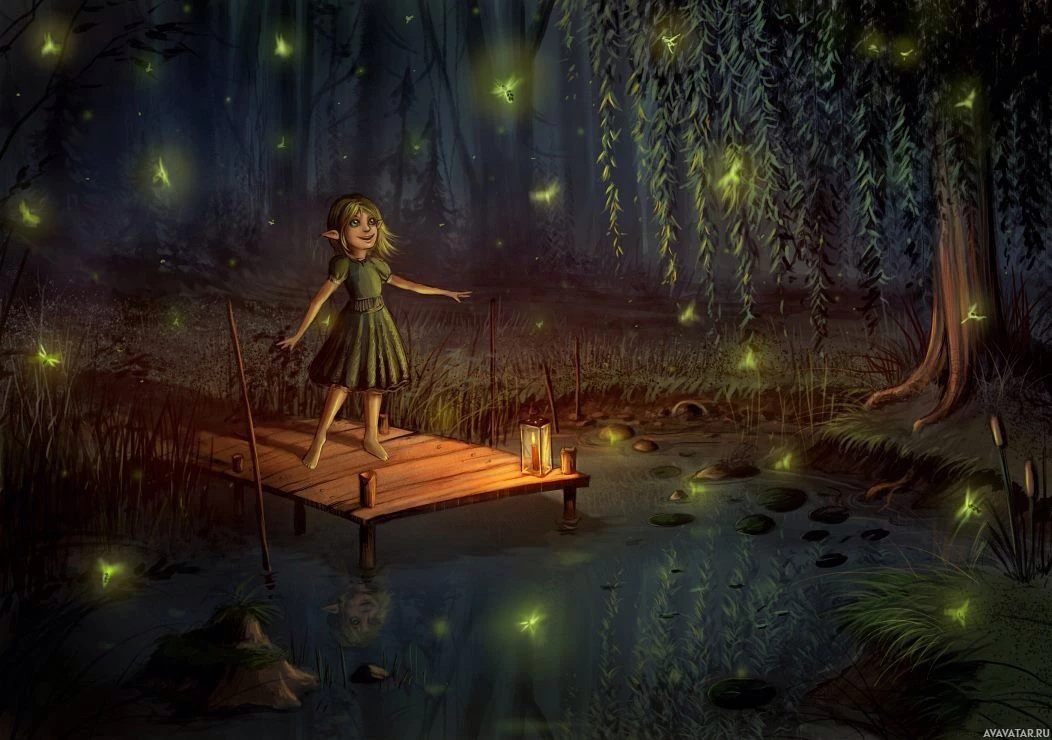 a young girl standing barefoot on what appears to be wooden boards extending over shallow water. She has her arms outstretched, and she seems to be looking up at a group of bioluminescent fireflies that are flying towards her from both sides. The background suggests a lush,