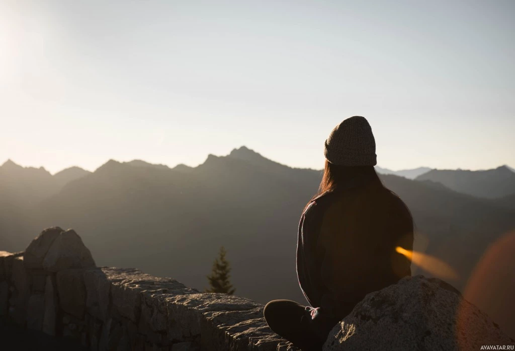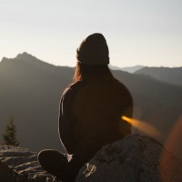 a scenic view of mountains during either sunrise or sunset, given the warm colors in the sky. There are no other individuals visible in the photo. The person's head is slightly tilted downward as they seem to be lost in thought or contemplating the landscape.