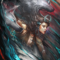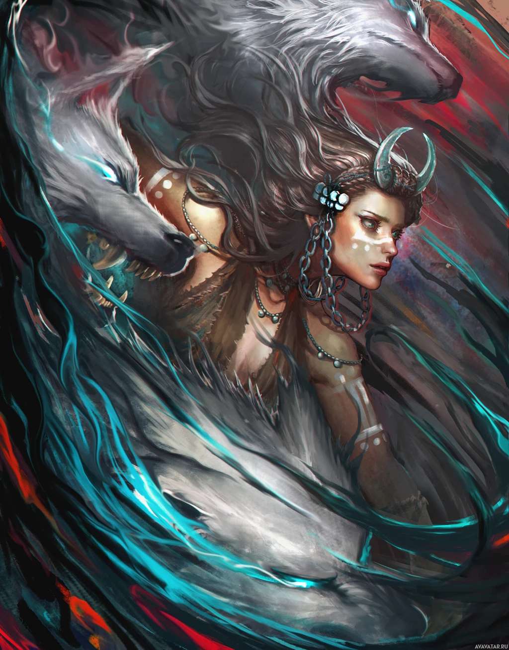 wolf ears, surrounded by wolves. The image has a surreal and ethereal quality to it, with the woman appearing both human and wolf in nature. The colors are rich and vibrant, with blues dominating the background that suggest a mystical or otherworldly environment.