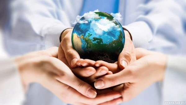 The image shows two hands gently holding a model of the Earth between them, symbolizing care or protection for our planet. The hands are placed close together, suggesting unity and collaboration in