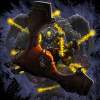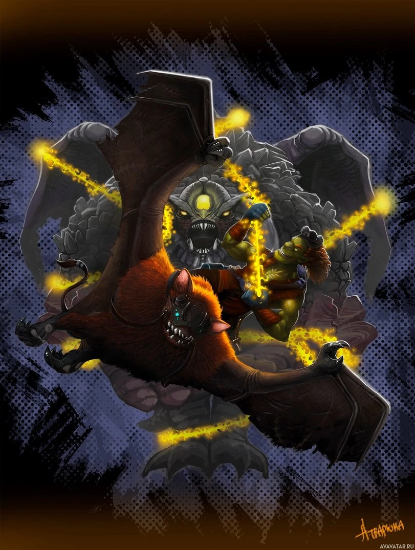 The image depicts a fantasy-themed illustration featuring two characters engaged in combat. On the left, there is a large bat creature with a fierce expression and a chainmail armor, likely representing Roshan from