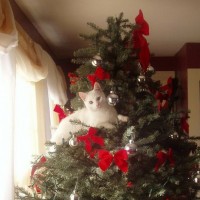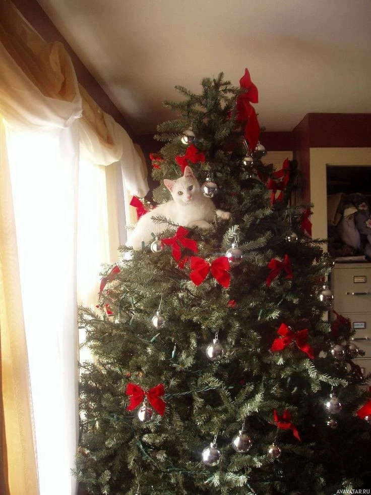a Christmas tree. The tree is decorated with red and silver ornaments, and there are