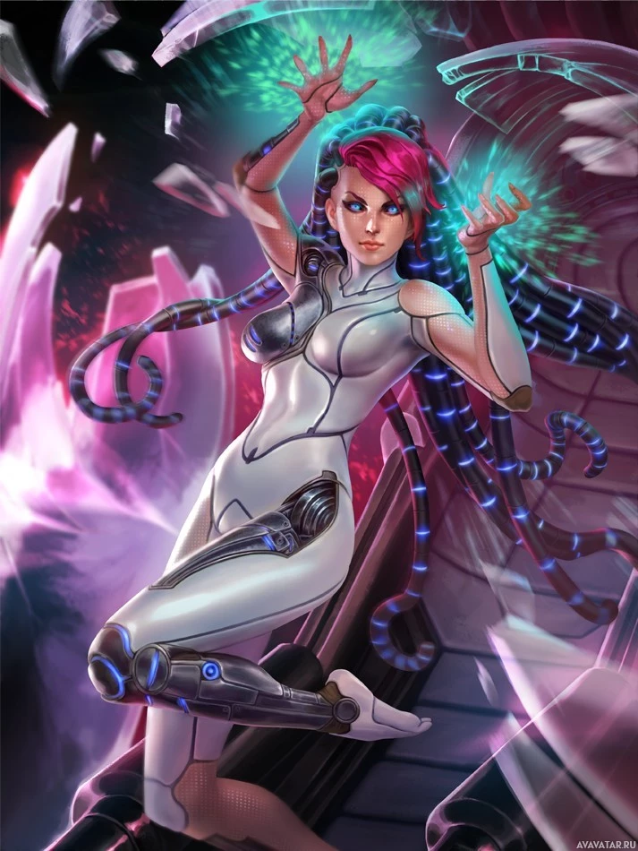 an animated character dressed in futuristic armor, with a distinctive design that includes blue and pink elements. She appears to be interacting with some form of technology or power source, as suggested by