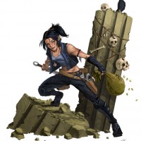 dark hair, wearing attire reminiscent of medieval or fantasy clothing, which includes a leather jacket and pants, as well as boots. She's holding a weapon that looks like a crossbow, and there are skulls around her, suggesting she may be associated with some sort of pirate or adventure setting. The background is minimalistic, featuring rocks and what appears to be a bird perched on the left side of the image. There is no text in the image.