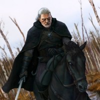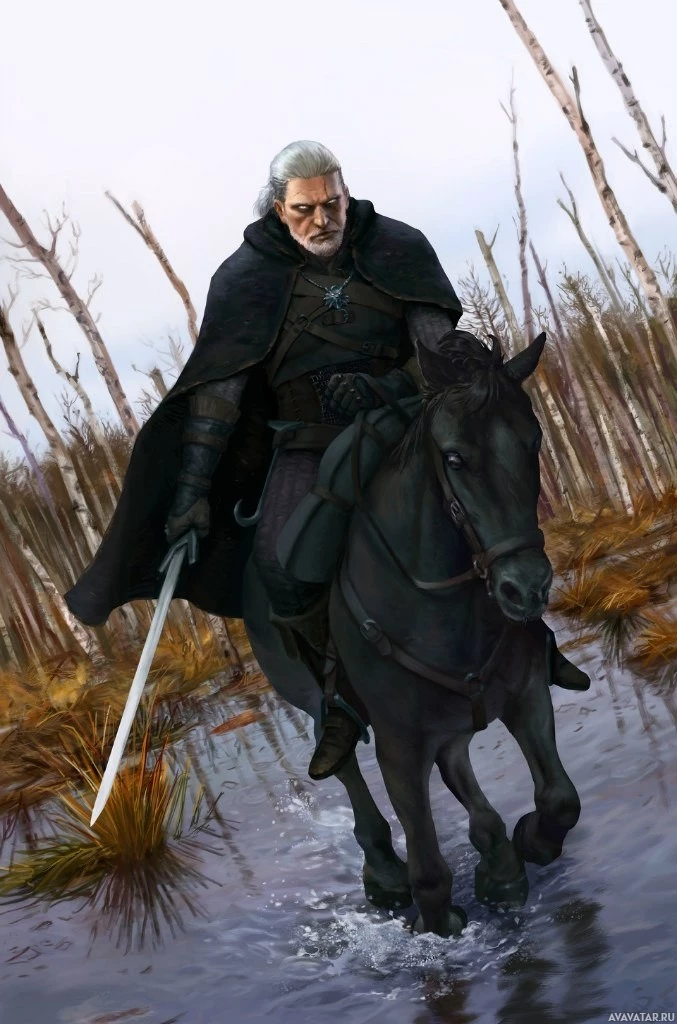 Geralt of Rivia, portrayed as a rugged, middle-aged man with facial hair. He is wearing armor and carrying a sword in his right hand while riding a horse through what appears to be a marshy or swampy area. The scenery suggests the game's