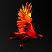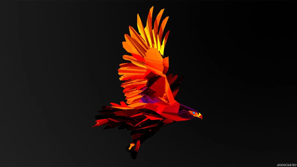 На картинке изображена яркая птица, вероятно, попугай или другой вид с аналогичными цветами, в полете. У него оранжевое и желтое тело с фиолетовыми акцентами на голове и шее. Крылья птицы вытянуты наружу, когда она парит по воздуху.