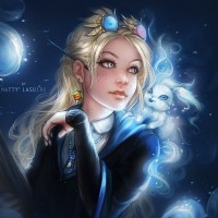 magical creature perched on her shoulder. The background includes swirling blue clouds and stars, which adds to
