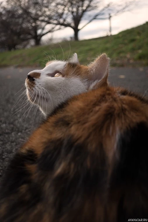 an asphalt surface, possibly a road or path. The cat has a distinctive