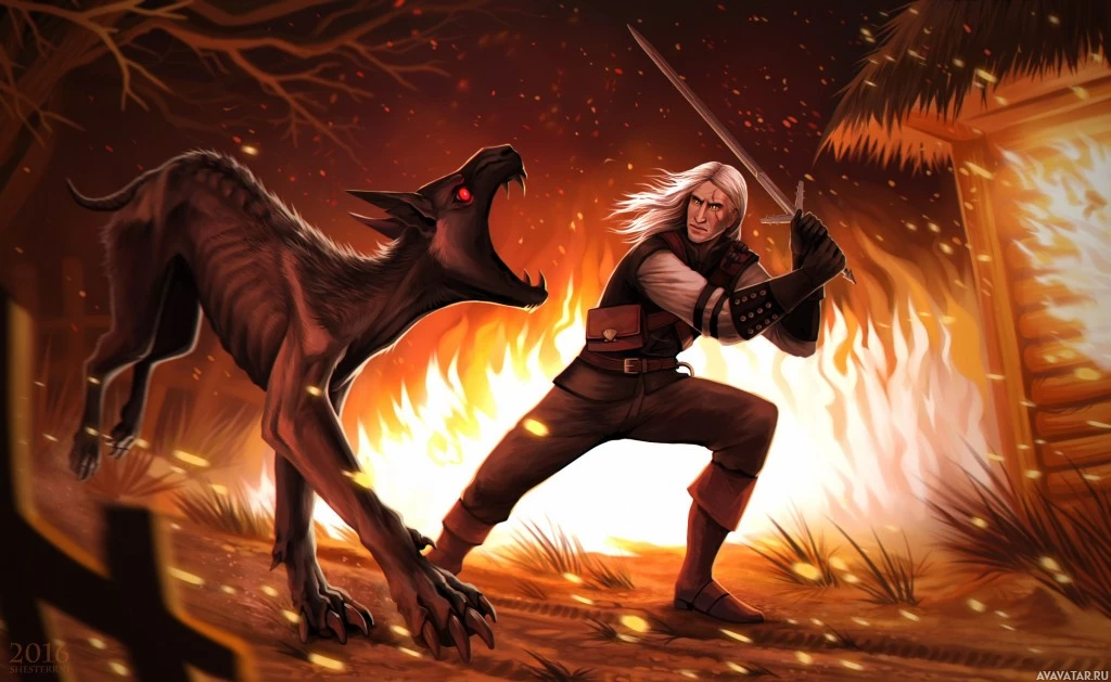 В образе присутствует персонаж по имени Геральт из Ривии из видеоигры «Ведьмак 3: Дикая Охота». Он держит меч и, кажется, находится в противостоянии с двумя чудовищными существами. Сцена выглядит как лес ночью, с огнем, освещающим сцену. Вокруг ног Геральта видно пламя, предполагая, что он может быть в центре интенсивной битвы или противостояния.