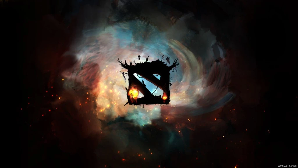 Изображение представляет собой художественное изображение логотипа Dota 2. Он имеет огненный и мистический вид, с такими элементами, как пламя и молнии, окружающие центральный светящийся круг, в котором находится логотип Dota 2. Фон предполагает космическую или магическую атмосферу, которая соответствует фантастической обстановке самой игры.