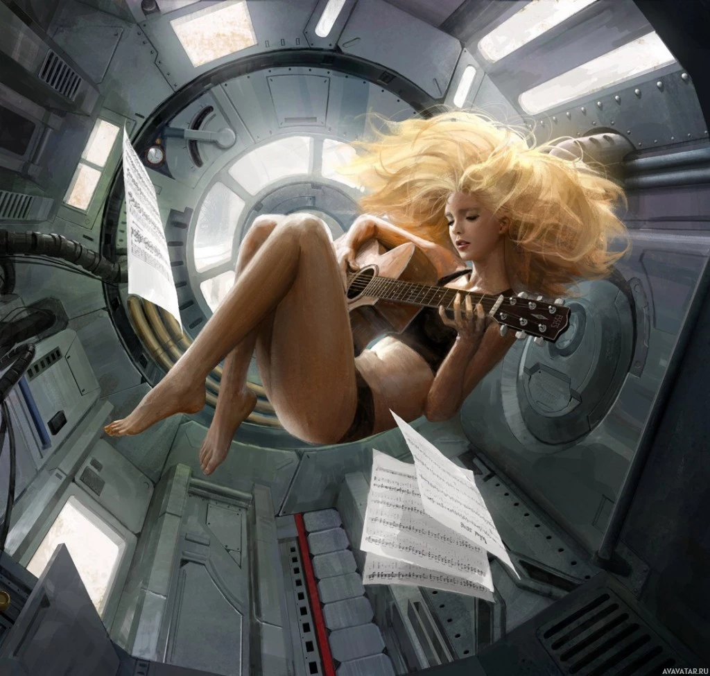 blonde hair playing an acoustic guitar. She is seated on a metallic structure that resembles a control panel or console, and the setting appears to be a spacecraft or