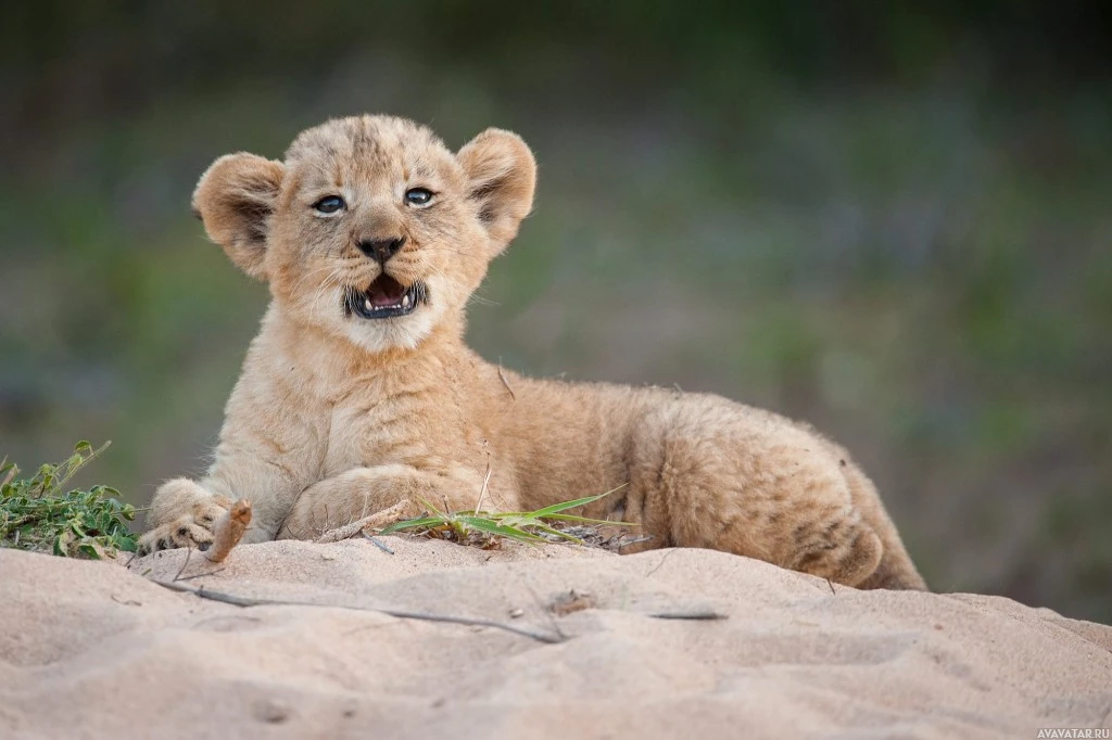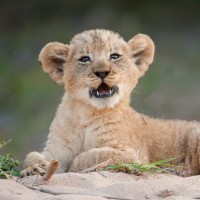 lion cub. The cub appears to be sitting or lying down on what looks like