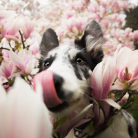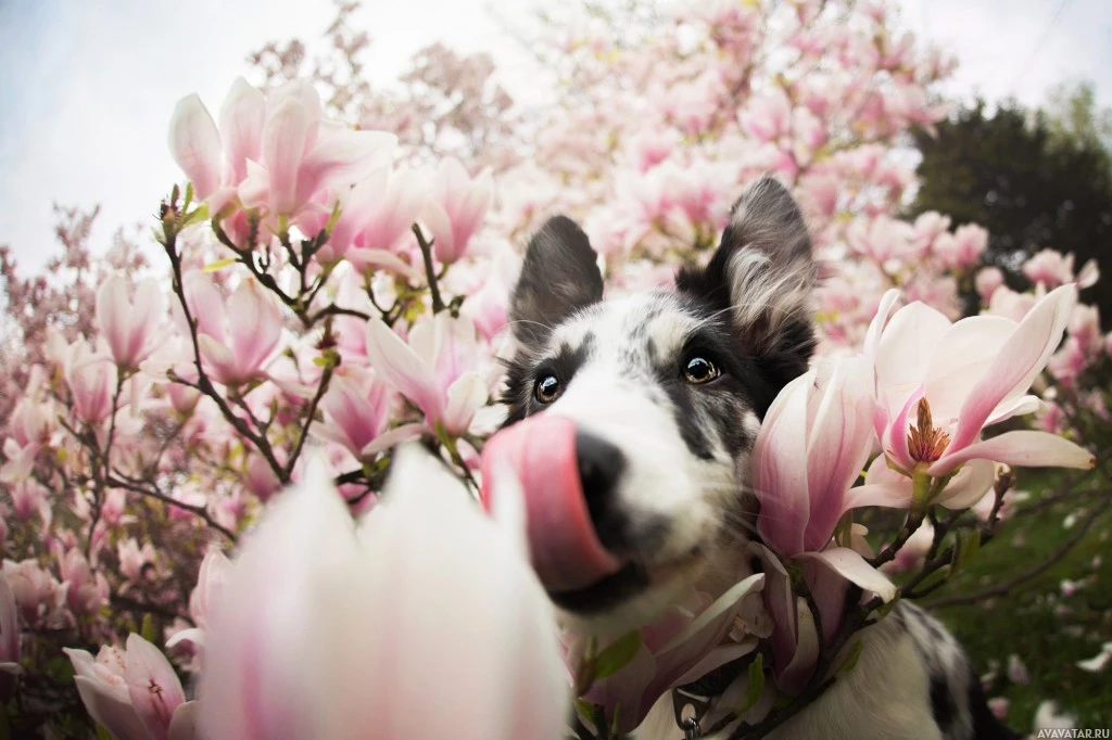 flowering trees. The dog appears to be looking directly at the camera and sniffing the blossoms. It's a beautiful spring scene with