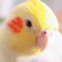 a yellow parrot with an orange spot on its cheek. It appears to be in focus, which makes it the main subject of the photo. The background is blurred and indistinct, but there seems to be greenery or some foliage visible. The bird has its head tilted slightly downward, possibly looking at something or showing