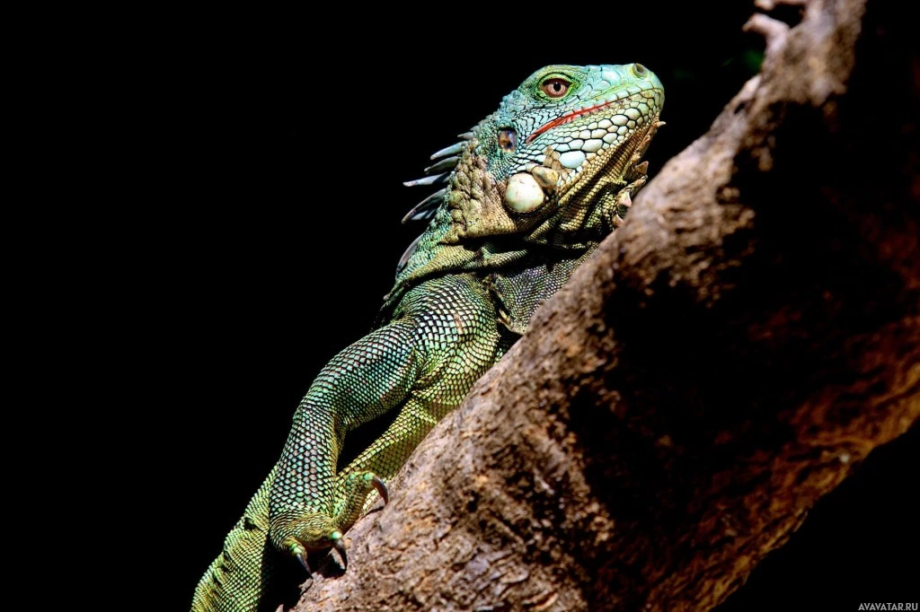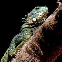 На картине изображена ящерица, обычно называемая игуаной. Он расположен на ветке дерева с хвостом, обернутым вокруг него для поддержки. Фон кажется естественным и плотным, вероятно, является частью среды обитания игуаны в лесу или джунглях.